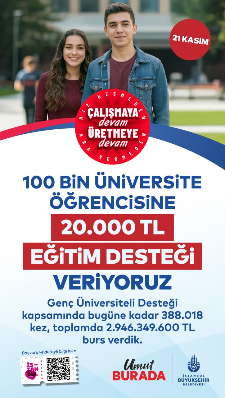 İBB’nin üniversiteli öğrencilere verdiği ‘Genç Üniversiteli Sosyal Desteğine” başvurular devam ediyor. Destek kapsamında, 100 bin öğrenciye 20 bin TL’lik maddi katkı sunulacak. Başvurular, 21 Kasım Cuma gününe kadar uzatıldı.